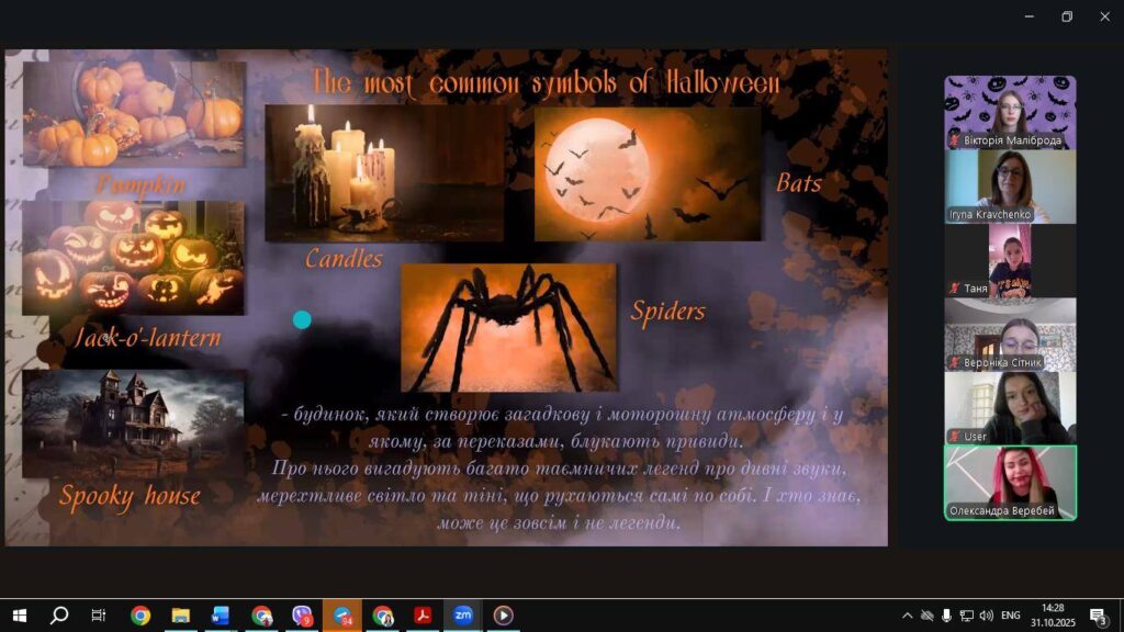 В рамках проведення тижня циклової комісії професійної та практичної підготовки спеціальності А4 Середня освіта ( українська мова і література, англійська мова) 31 жовтня студенти першого курсу долучилися до лінгвокраїнознавчого заходу на тему: «Halloween/Veles Night: Cultural Traditions and Language». Наприкінці жовтня вулиці, кав’ярні, вітрини магазинів нагадують про наближення свята Halloween. Ставлення українців до цього дійства є неоднозначним, однак країнознавча компетентність є важливою складовою для майбутніх учителів англійської мови. Студенти групи СО-12 провели невелике дослідження витоків цього свята, його суть та важливість для давніх кельтів; як традиція святкування розповсюдилася за межі острова Британія, чому на наступний день у багатьох країнах припадає День усіх святих. Цікавими були доповіді студентів щодо символів та традицій святкування; дослідження ідіоматичних виразів у лексиці англійської мови; особливості сучасного святкування. Студенти зазначали, що нашим пращурам-язичникам також було притаманне поклоніння богам, а обряди вшанування бога Велеса нагадують обряди кельтського свята.